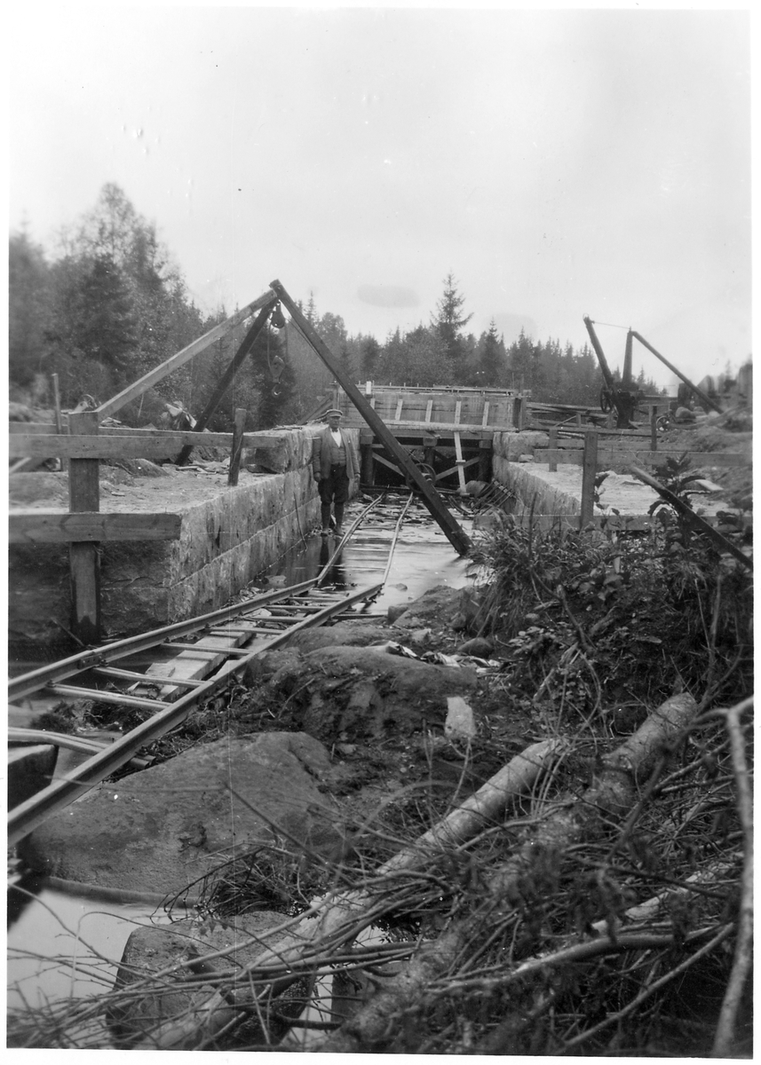 Trumma över Pinebobäcken 3x1,5 murverk. Decauvillespår, de färdiga rälslängder användes som provisoriska banor för banarbetsfordon.