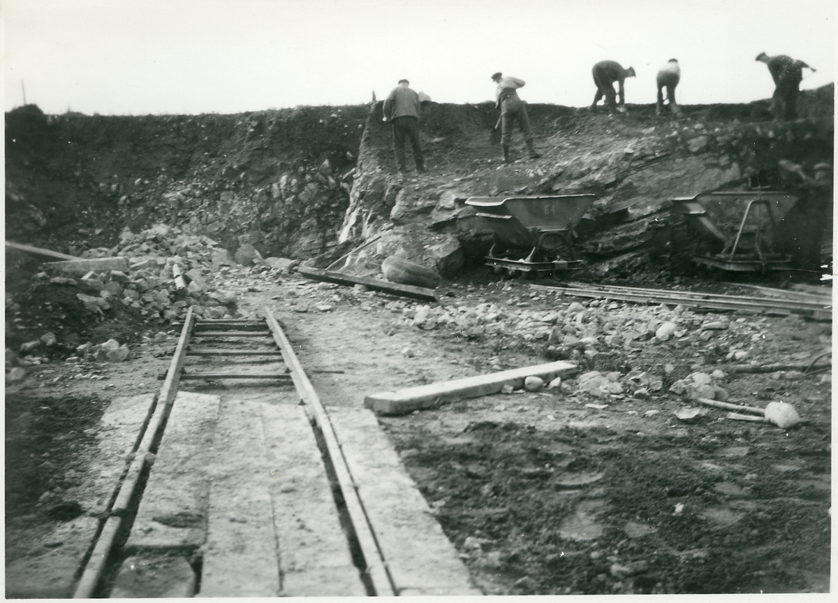 Bergavtäckning vid Strängsereds station. Decauvillespår, de färdiga rälslängder användes som provisoriska banor för banarbetsfordon.
