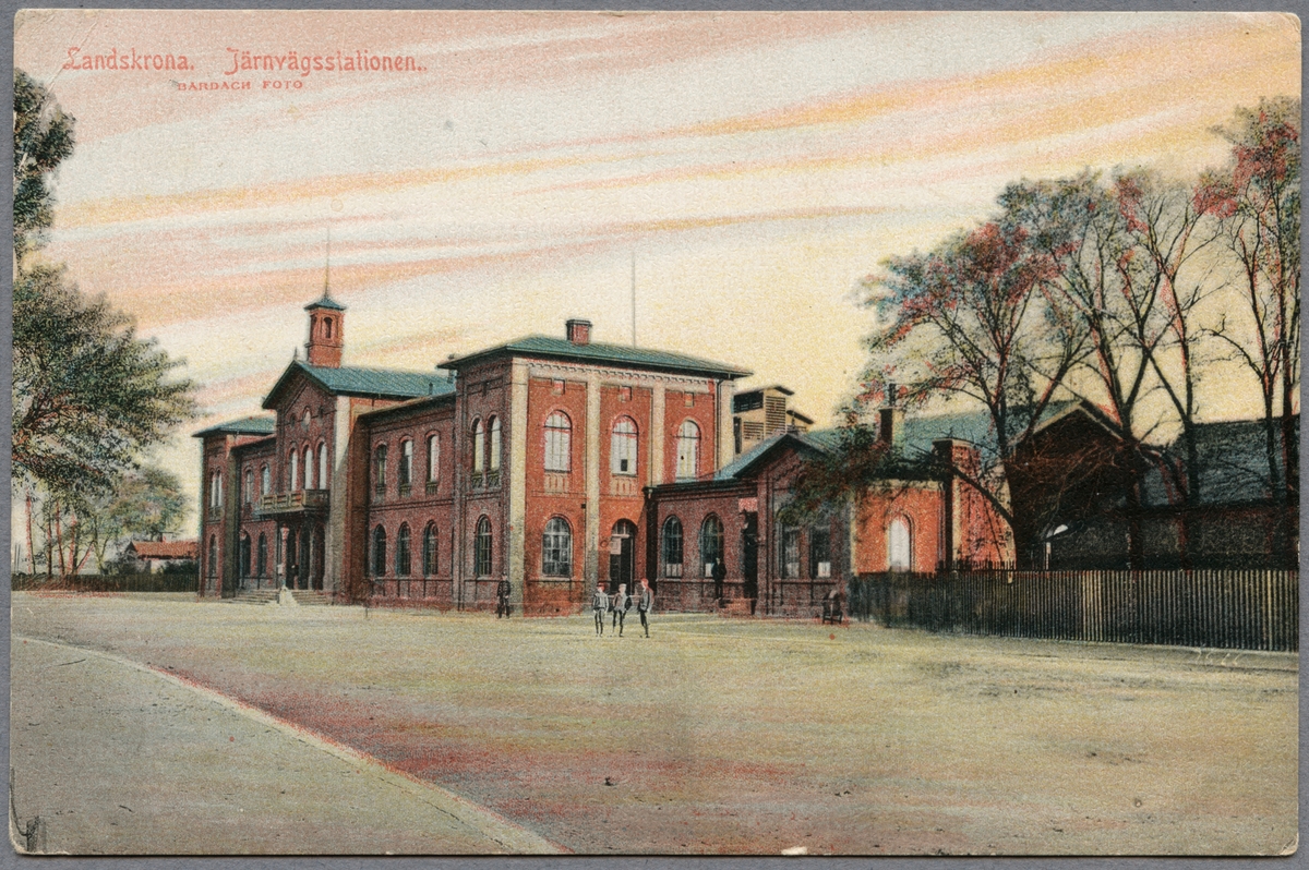 Handkolorerat vykort med järnvägsstationen i Landskrona.