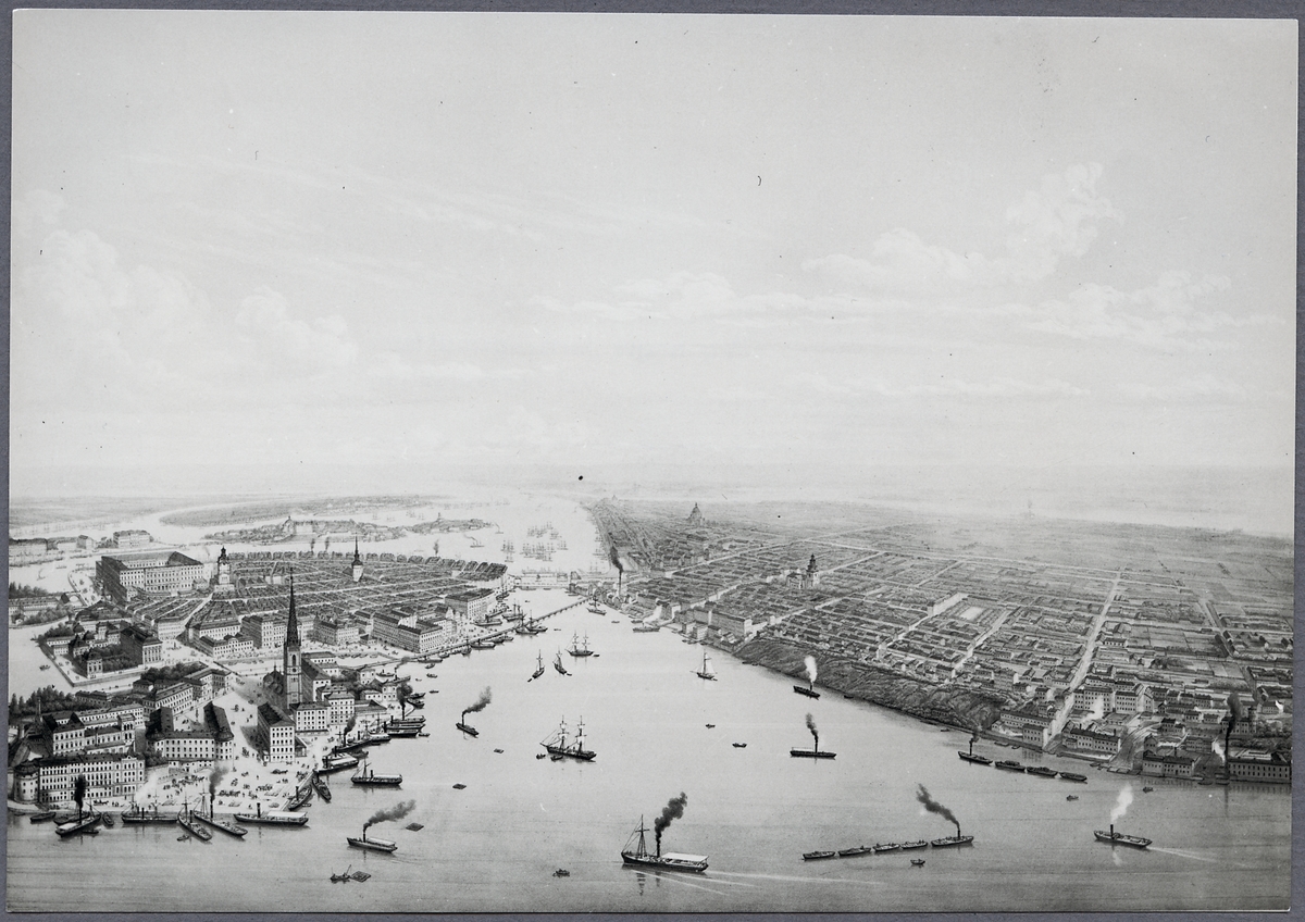 Rundmålning över Stockholm ca 1872-1873. Färglitografi efter Otto August Mankells målning av Alexander Nay. Riddarholmen och Söder.