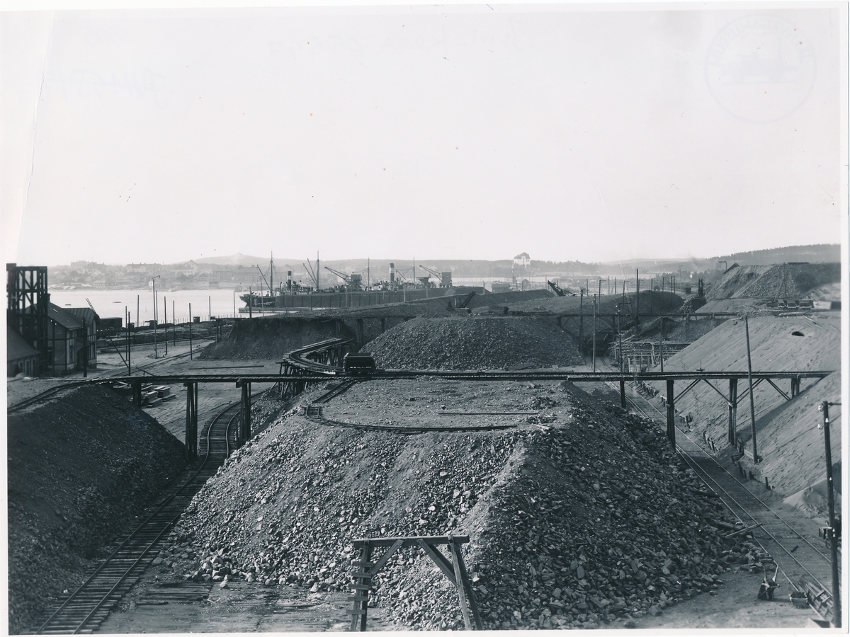 Malmupplag i Luleå station. 1888-03-12 det första malmtåget kom ned till Luleå. Stationshuset färdigtbyggdes 1887. Exploateringen i malmgruvorna började öka. Kapaciteten har successivt också ökat genom förstärkning av bana, broar, mötesstationer och elektrisk drift. Malmbanan byggdes av Sverige & Norges Järnväg.