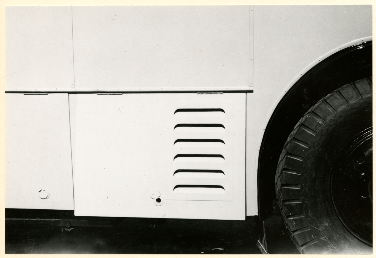 Titel: Utsidan av buss strax intill ett av hjulen.