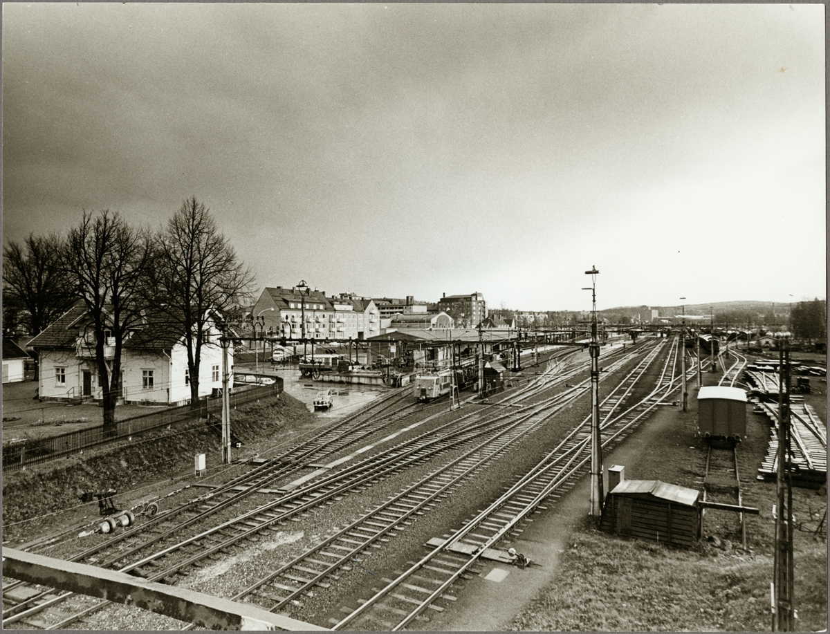 Vy över Ludvika bangård med omlastningsmagasin till vänster.