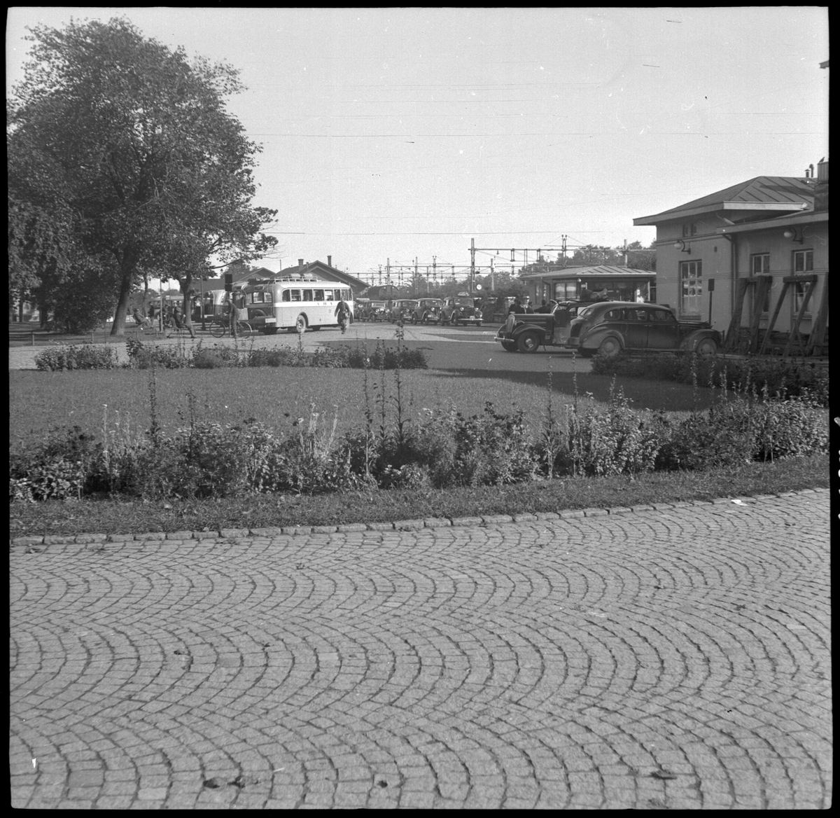 Gengasutrustade personbilar och bussar parkerade vid stationsplanen utanför Skövde station.