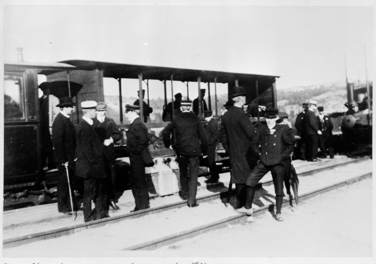 Titel: Resande på spåret bredvid den öppna personvagnen.