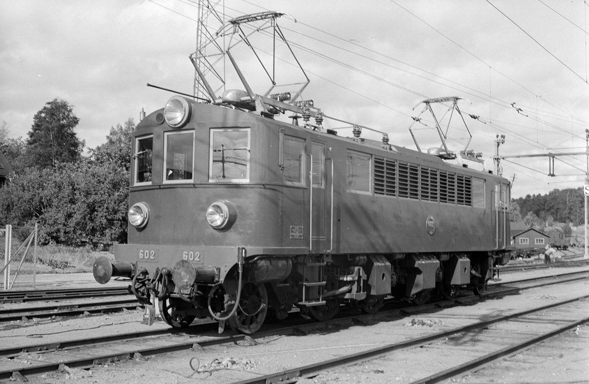 Statens Järnvägar, SJ F 602. Ramverkslok med ramplåtarna utanför hjulen samt tre frontrutor. Ett av tre provlok som beställdes 1939 från Asea AB Svenska Järnvägsverkstäderna, ASJ, i Falun, Motala Verkstad och Nydqvist & Holm AB, Nohab. Loken levererades 1942 och numrerades 601-603. I de tre provloken testades bl a olika typer av kraftöverföring och löpaxelkonstruktioner.