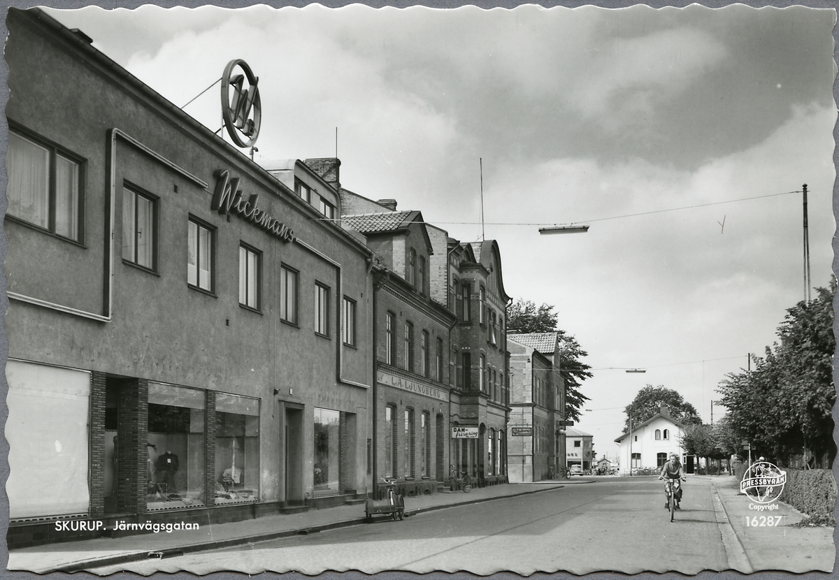 Cyklist på Järnvägsgatan i Skurup. Malmö - Ystads Järnväg, MYJ.
