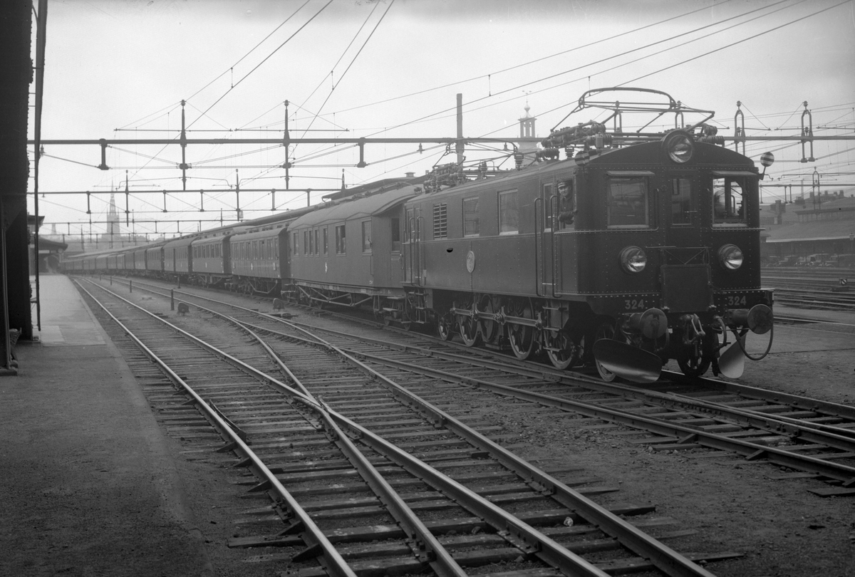 Provtåg i samband med elektrisk drift till Uppsala. Statens Järnvägar, SJ Ds 324. Andra och tredje vagn är Bo4 och Bo5 samt fjärde vagnen en Co13. Närmast lok mätvagnen Bo7 2249.