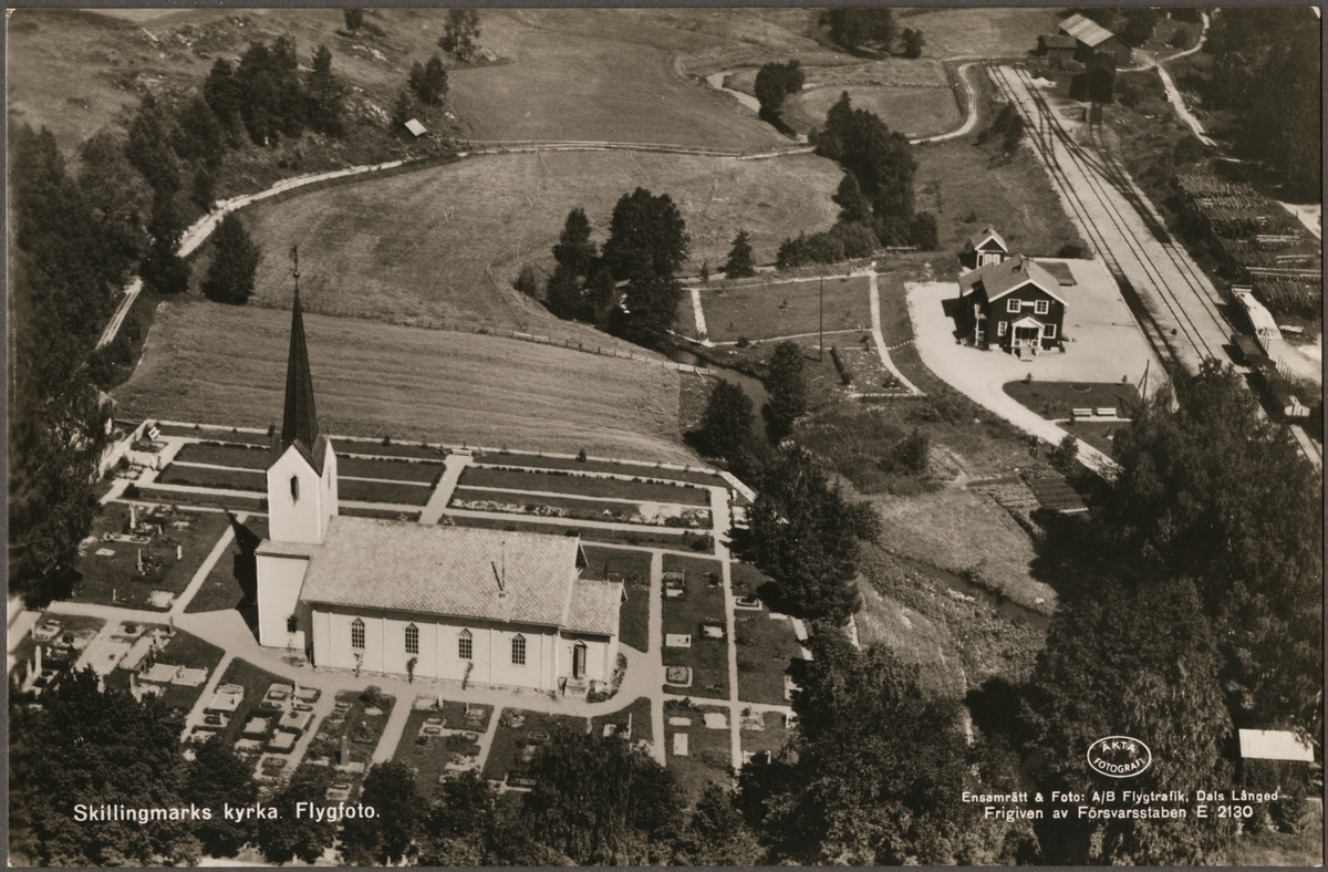 Flygfoto över Skillingmark kyrka och järnvägsstation.