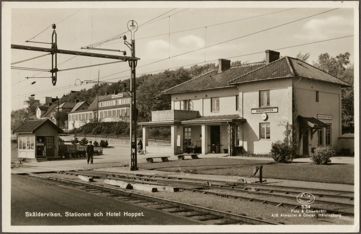 Skälderviken station med hotell i bakgrunden.