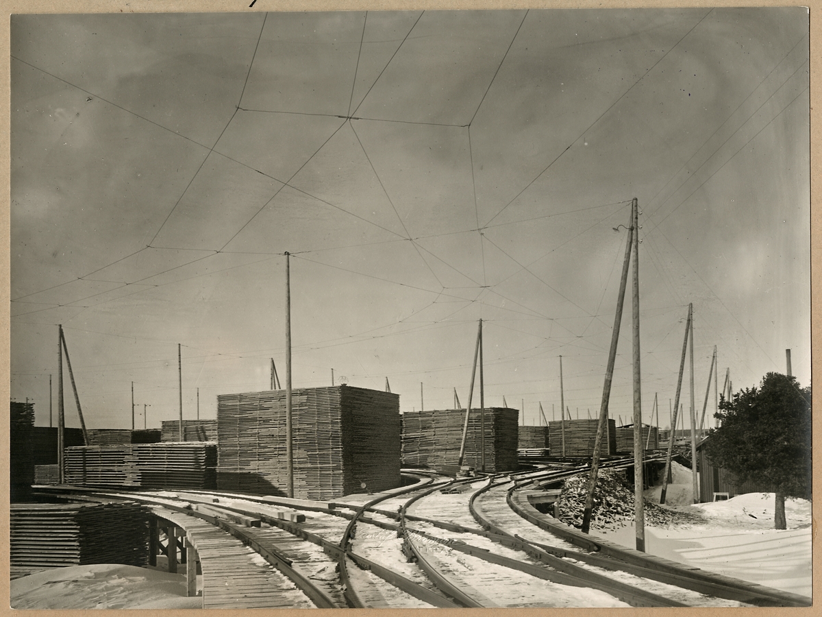 Räls på brygga till upplagsplats med sågat virke.