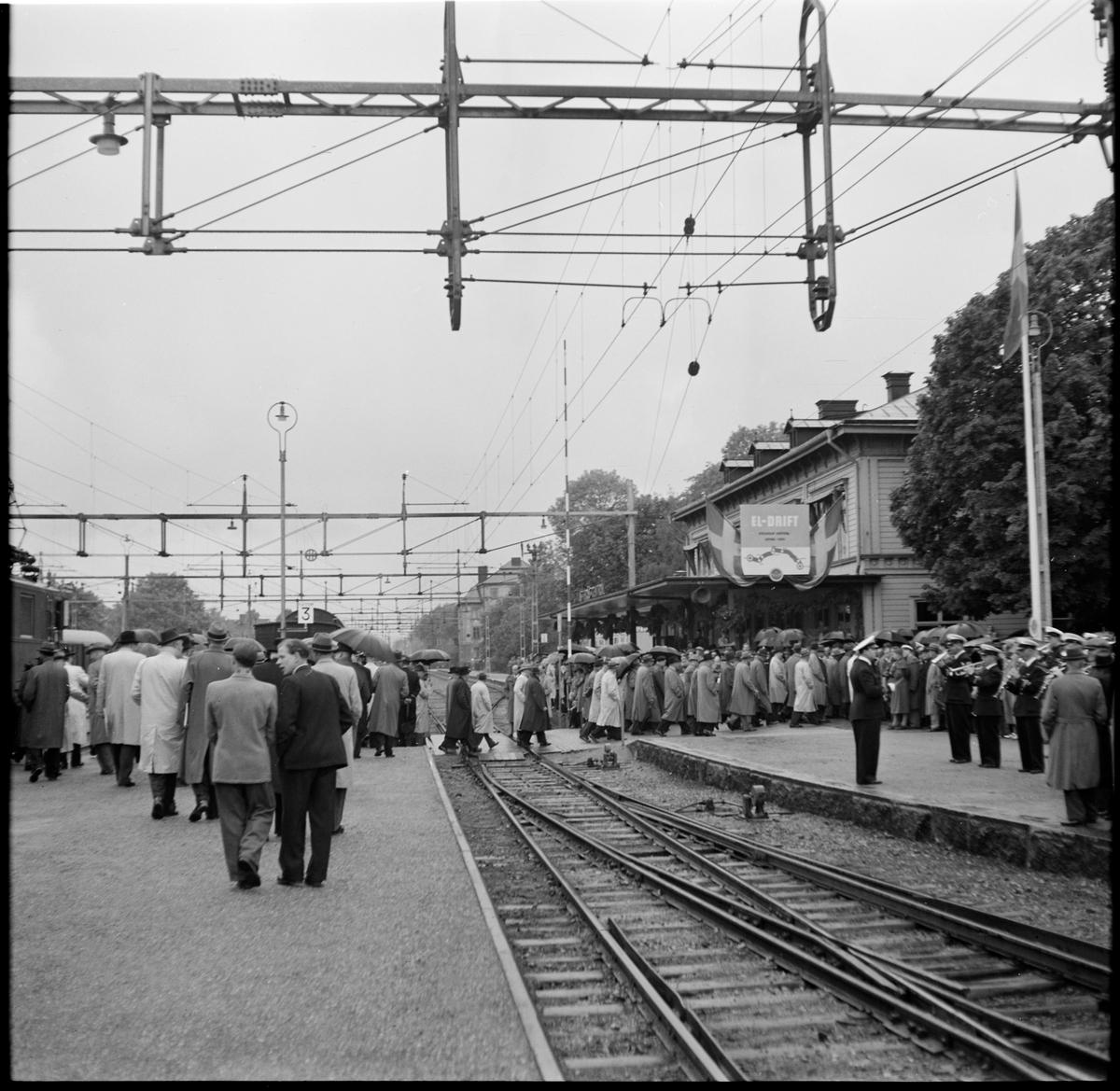 Folksamling på järnvägsstation för invigning av eldriften Stockholm, Västerås, Köping och Frövi.
