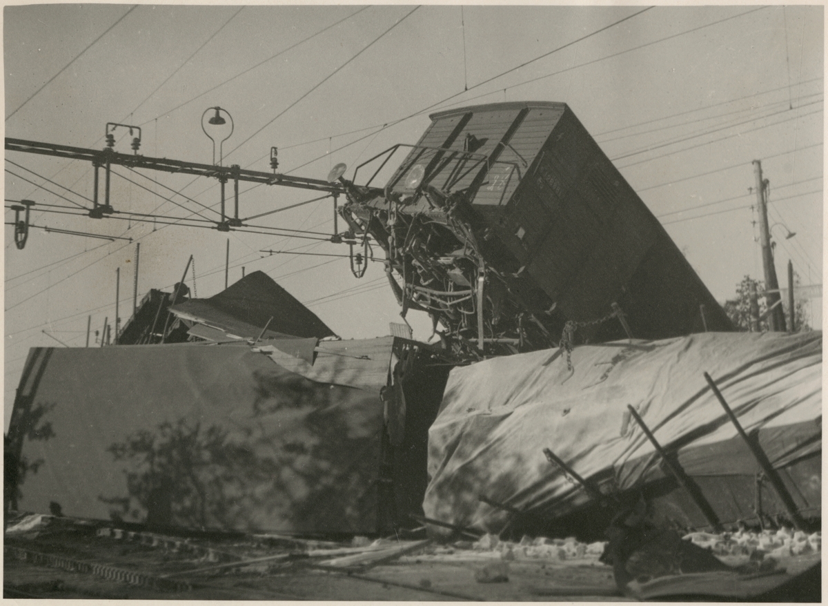 Godsvagnar efter urspårning med kontaktledning i bild.
