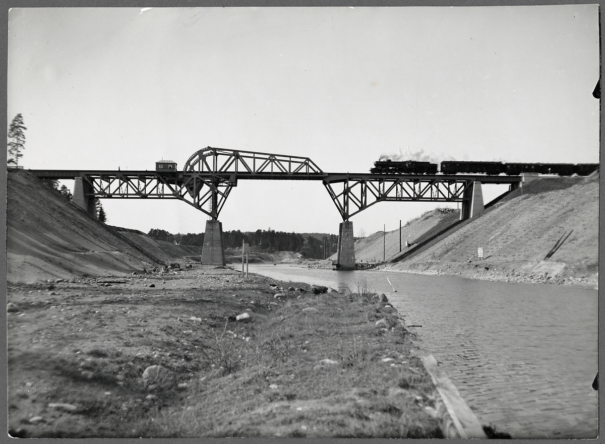 statens Järnvägar, SJ snälltåg 7 eller 17 rullar över bron draget av ett F-lok.