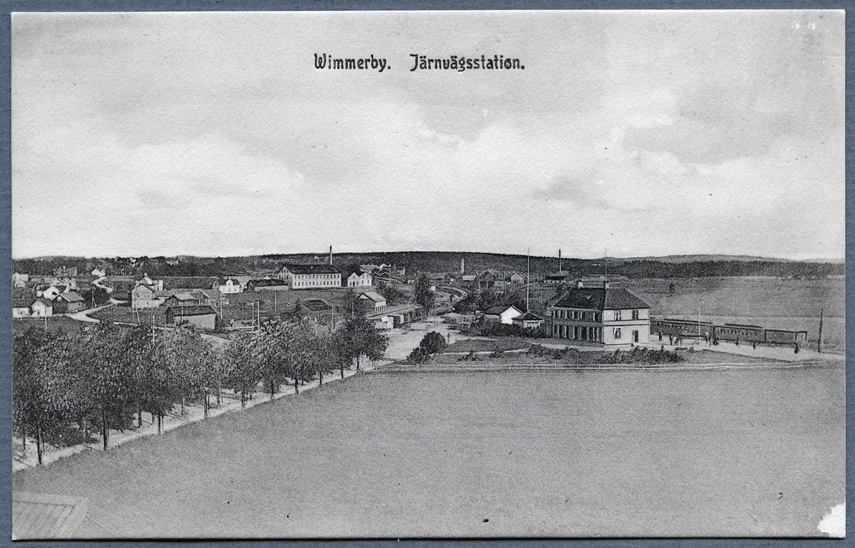 Vy över Vimmerby, med järnvägsstationen till höger i bild.
