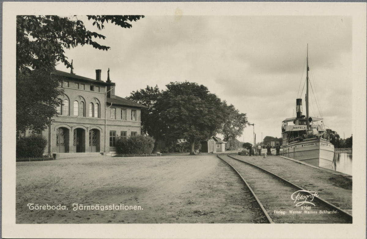 Järnvägsstationen i Töreboda med ångaren Motalaström i Göta kanal.