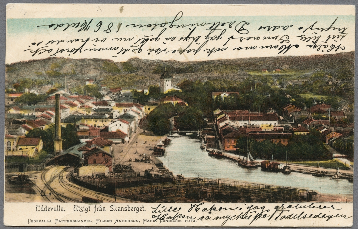Utsikt från Skansberget över Uddevalla hamn med klocktornet i bakgrunden.