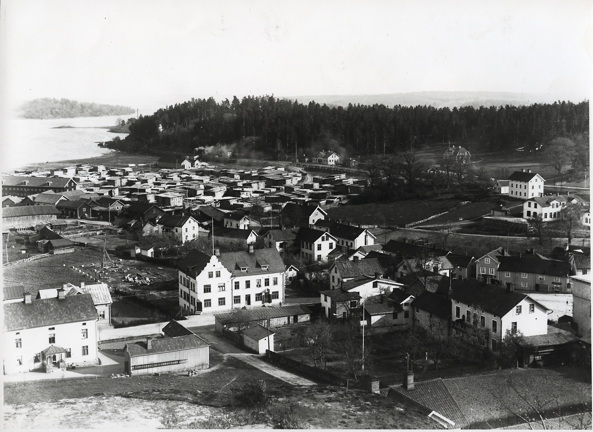 Gamleby köping. I bakgrunden syns järnvägsstation, lokstall och bangård.