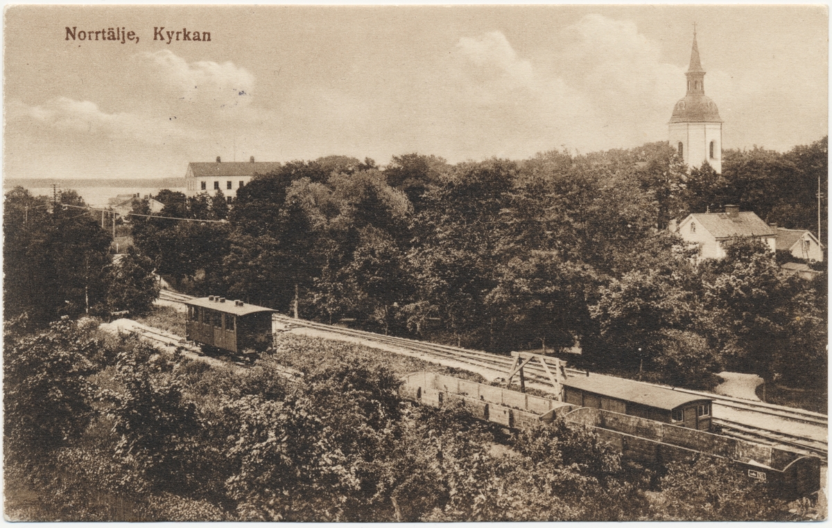 Vy över Norrtälje med kyrkan i bakgrunden och Järnvägen i förgrunden.