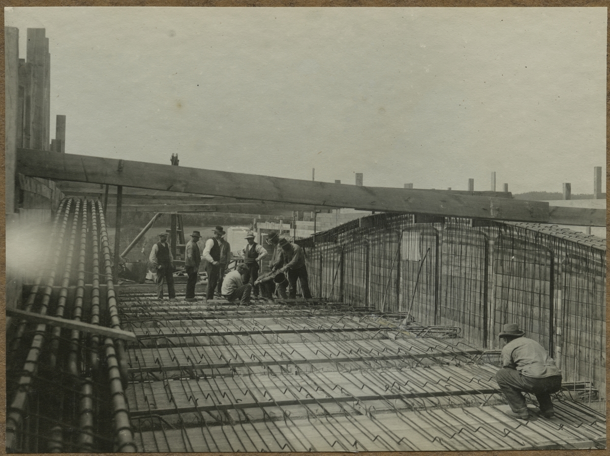 Dubbelspårsbyggnaden mellan Alingsås - Olskroken. Vägbron över västra ändan av Lerums bangård. Armering av vägbanan.