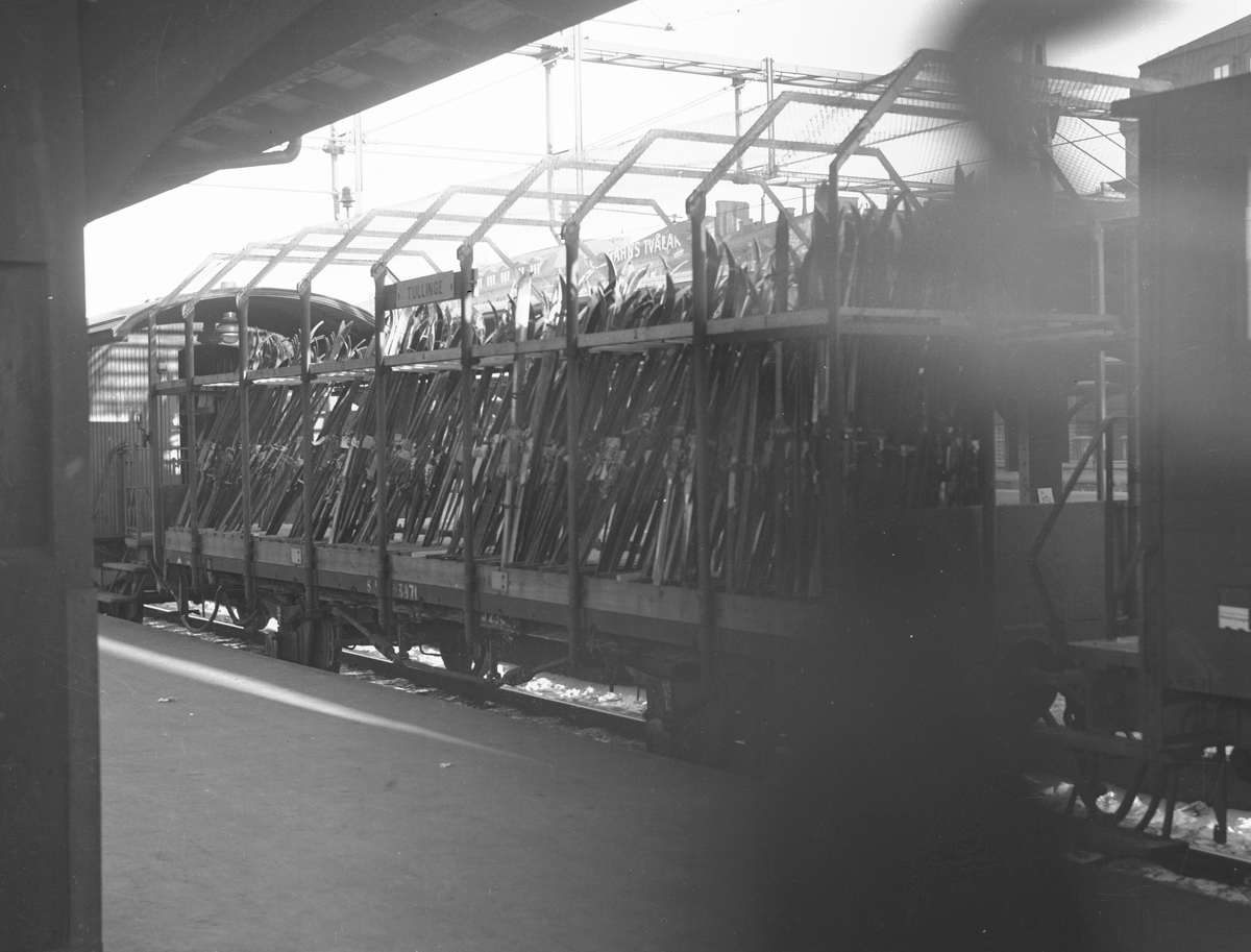 Statens Järnvägar, SJ skidvagn lastad med skidutrustning.