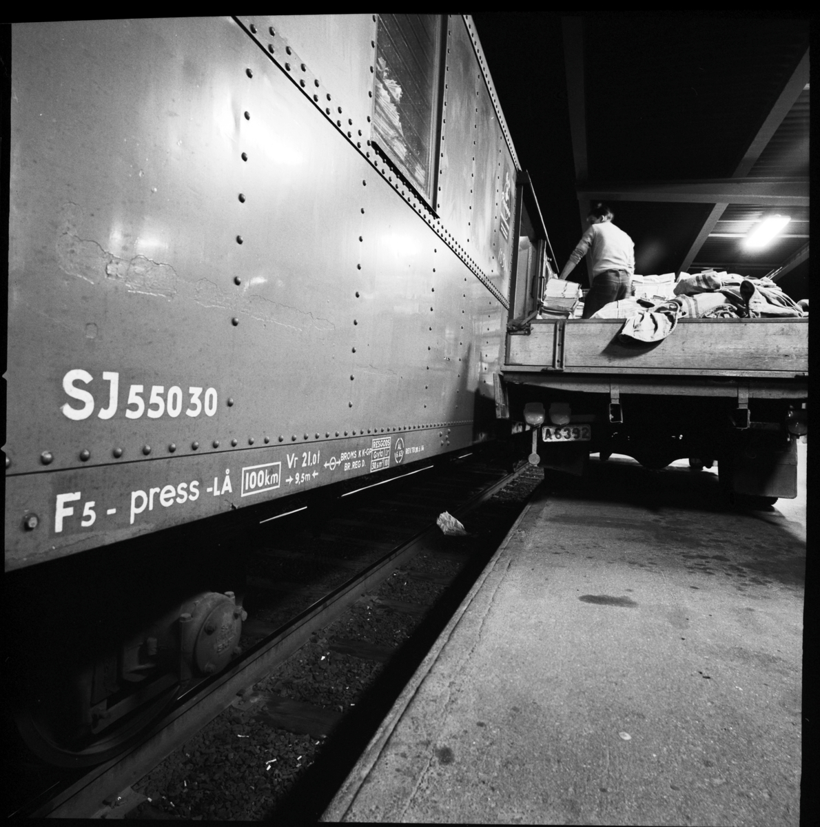 Statens Järnvägar SJ F5 55030. Tidningslastning för Pressbyrån, vid Ilgodset och bangårdsposten.