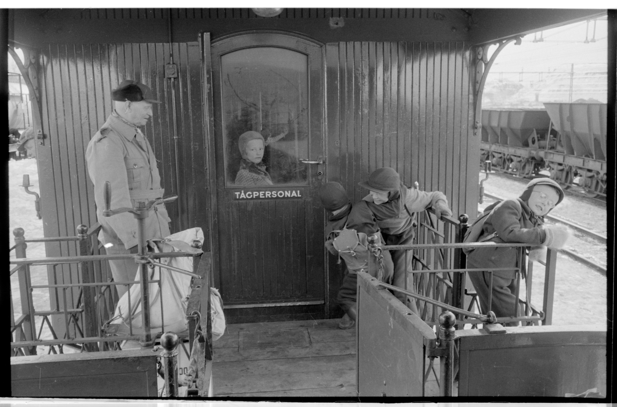 Lekande barn, som övervakas av en vuxen, på yttre plattformen på vagnen.