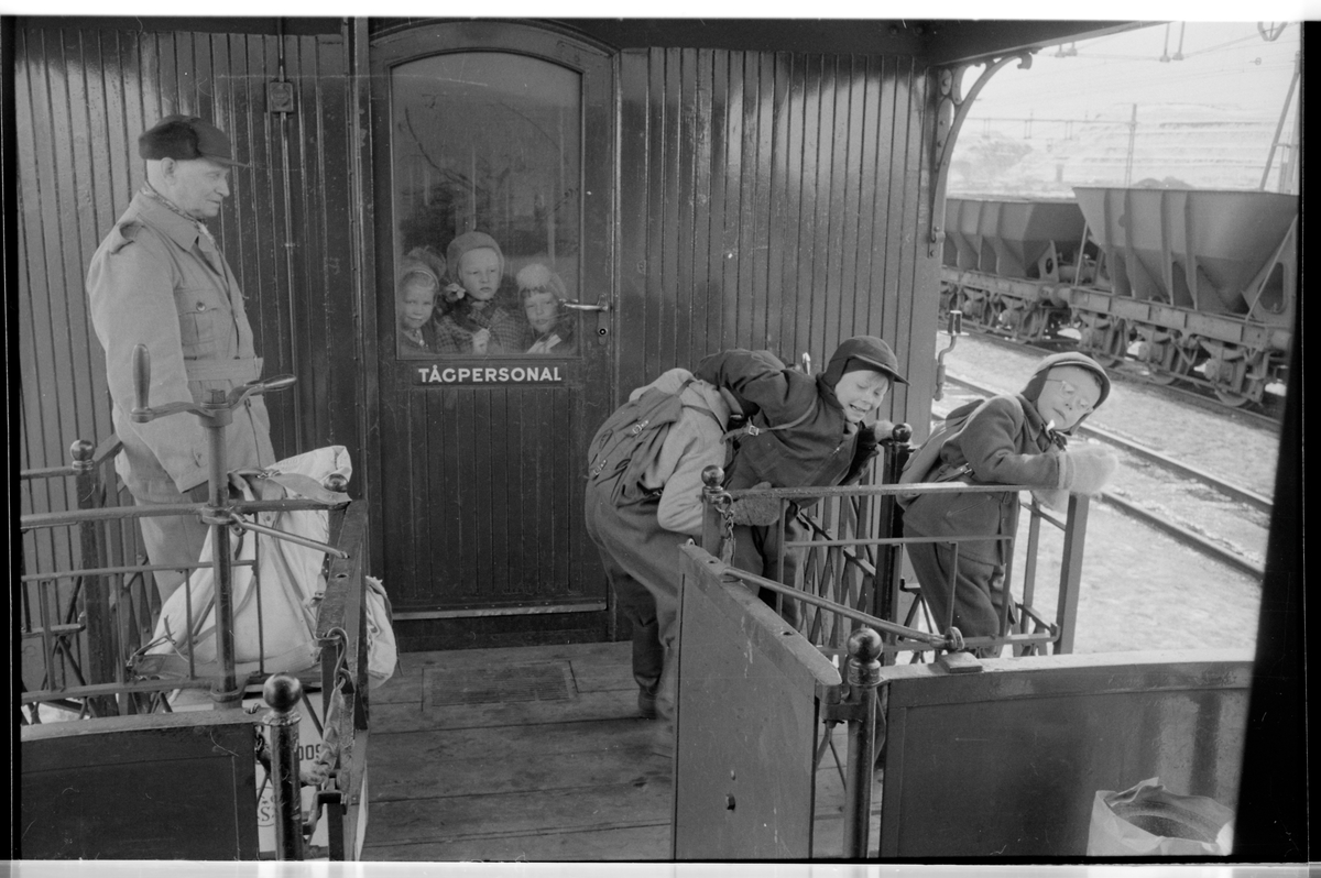 Lekande barn, som övervakas av en vuxen, på yttre plattformen på vagnen.