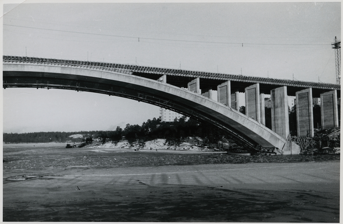 Byggnation av Tranebergsbron. Bron sträcker sig över Tranebergssundet mellan Kungsholmen och Traneberg.