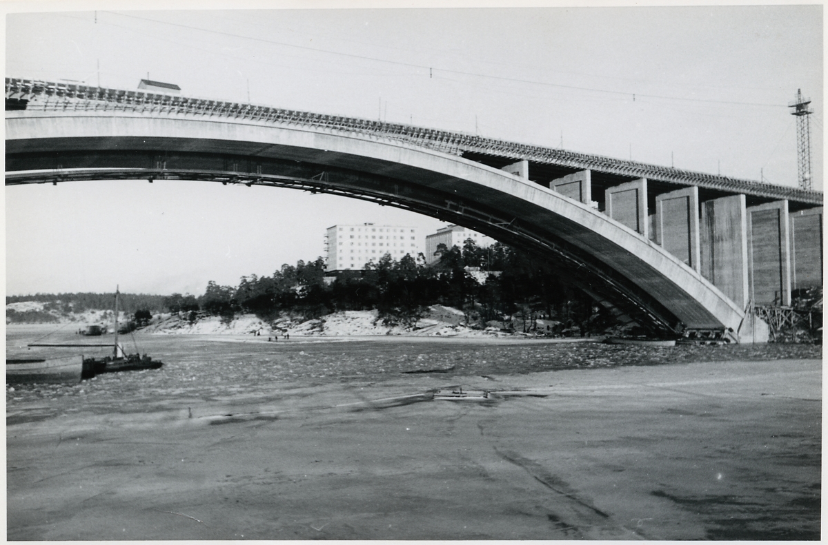 Byggnation av Tranebergsbron. Bron sträcker sig över Tranebergssundet mellan Kungsholmen och Traneberg.