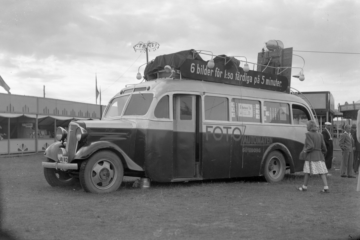 Chevrolet-buss, "Foto-automaten, Göteborg" . Vid något nöjesfält. Karossen tillverkad av Aktiebolaget Svenska Järnvägsverkstäderna, ASJ.