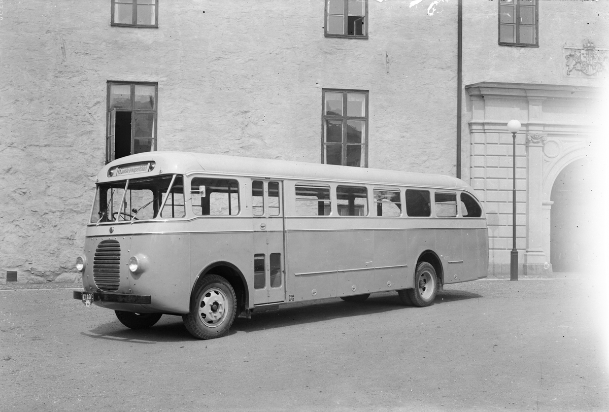 Okänd buss. Slottsbyggnaden i bakgrunden. Karossen tillverkad av Aktiebolaget Svenska Järnvägsverkstäderna, ASJ. Leveransfoto