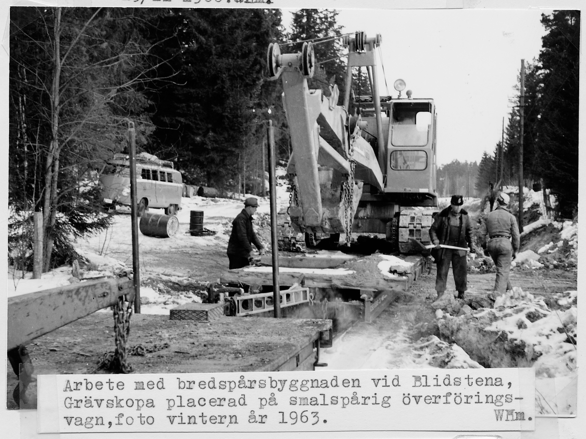Järnvägsbreddning till normalspår vid Blidstena på linjen mellan Åtvidaberhg och Västervik. Grävskopa placerad på slamspårig överföringsvagn.