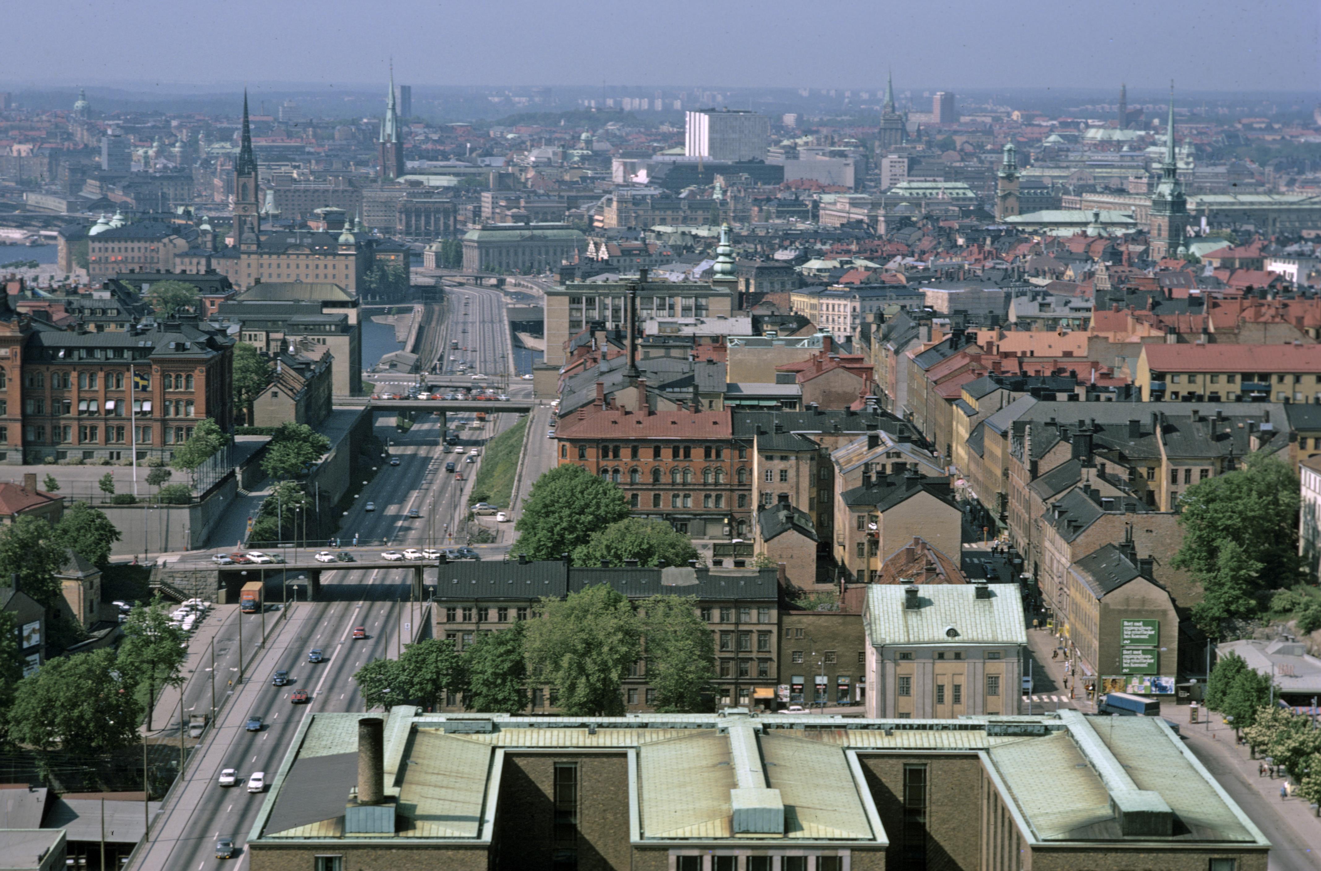 Utsikt från Skattehuset. Vänster i bild syns Söderleden, den numera övertäckta Söderledstunneln. Bilden troligen från början av 1970-talet.