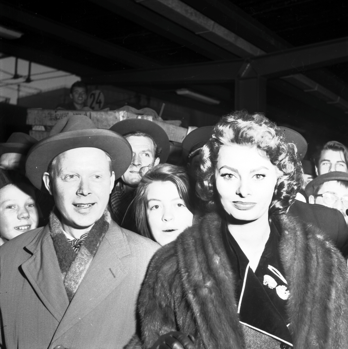 Italiensk skådespelerska, Sophia Loren gästar i Sverige. Skådespelerskan kom med tåg till Stockholm central och mötts av jublade folksamling.