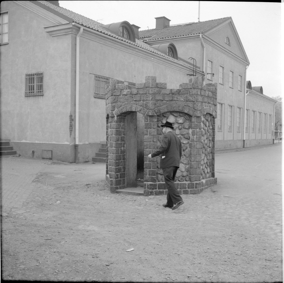 Man utanför byggnad.