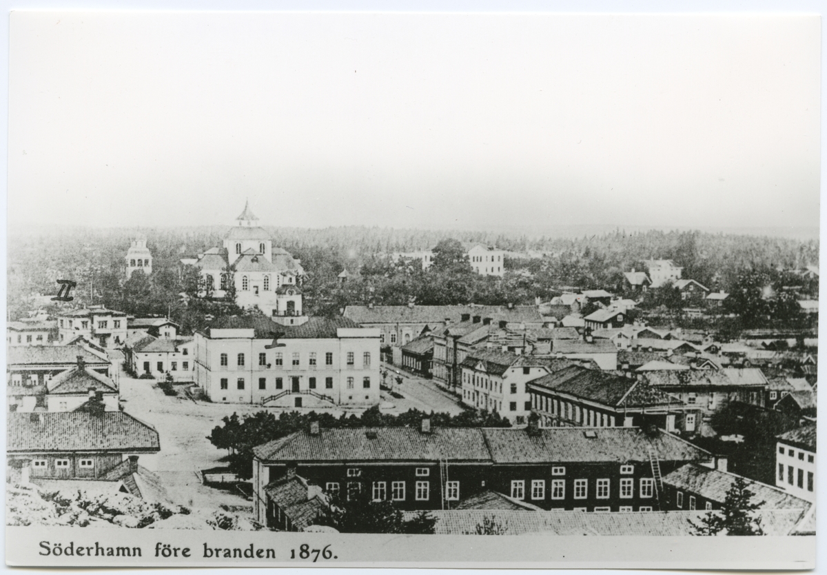 Söderhamn före branden 1876 . Rådhuset I och gamla banans stationshus II är igenkännliga.