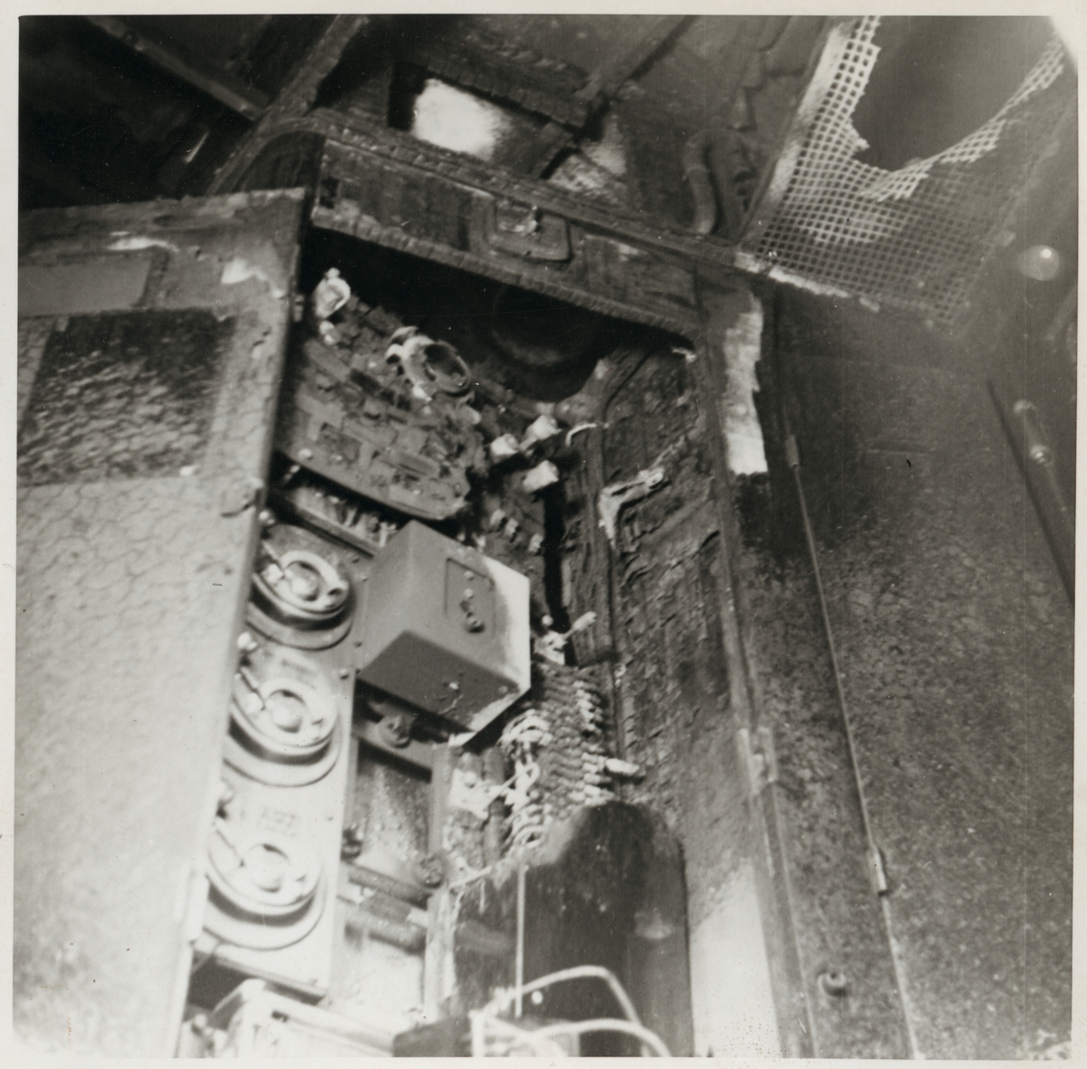 Titel: Skador efter brand i apparatskåpet i A-vagnen efter olycka i Malmö 1952.