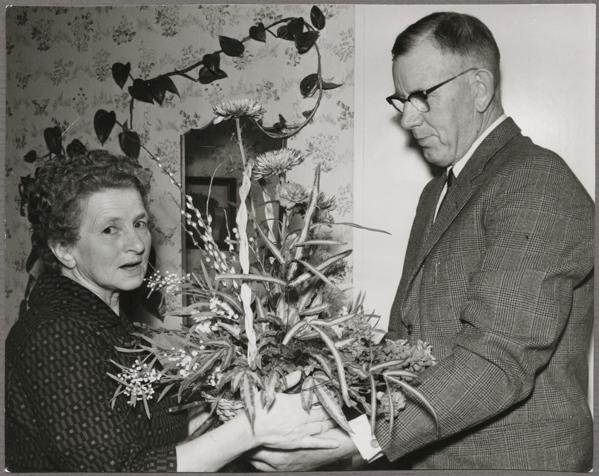 Sven Kagmark överlämnar blombukett till vagnstäderskan fru Anna Gustavsson vid pension från Trafikaktiebolaget Grängesberg - Oxelösunds Järnvägar, TGOJ.