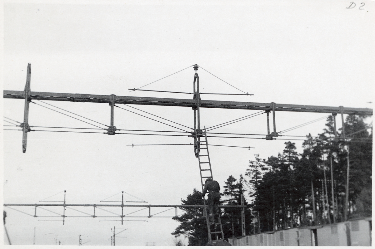Titel: Montering av utliggare på en kontaktledningsbrygga.