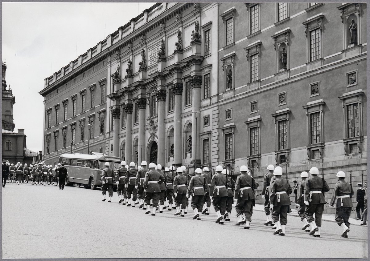Statens Järnvägar SJ driftvärn, Karlshamns division, går vaktparaden uppför Slottsbacken vid Kungliga slottet. Slottskyrkan skymtar till vänster i bild.