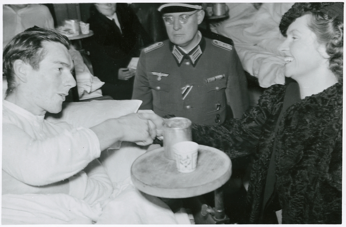 Prinsessan Sibyllas besök på tyskt sjukhuståg i Krylbo 13 november 1941, i sällskap med tysk nazistofficer.