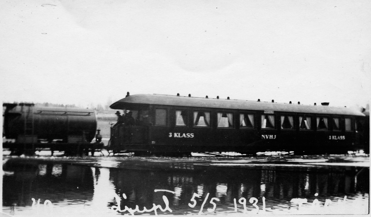 Översvämning i Uknadalen på linjen mellan Storsjö och Nelhammar. Norsholm - Västervik - Hultsfreds Järnvägar, NVHJ personvagn 23.