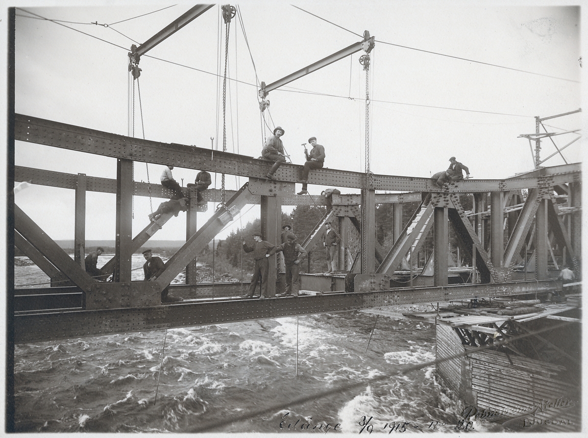 Uppförande av järnvägsbro över Ljusnan älv vid Edänge.