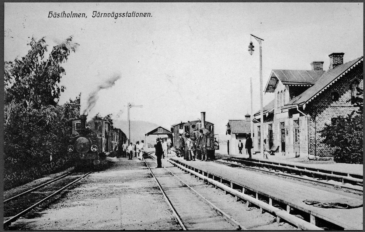Hästholmens station med två persontåg, ett normaspår och ett smalspår.