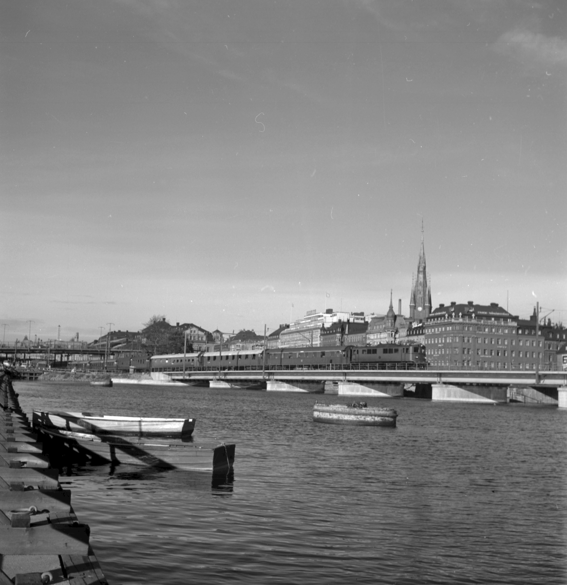 Tåg på järnvägsbro vid Tegelbacken, Stockholm