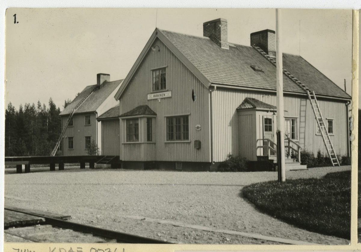 Envånings stationshus i trä, sammanbyggt i vinkel med godsmagasinet.
