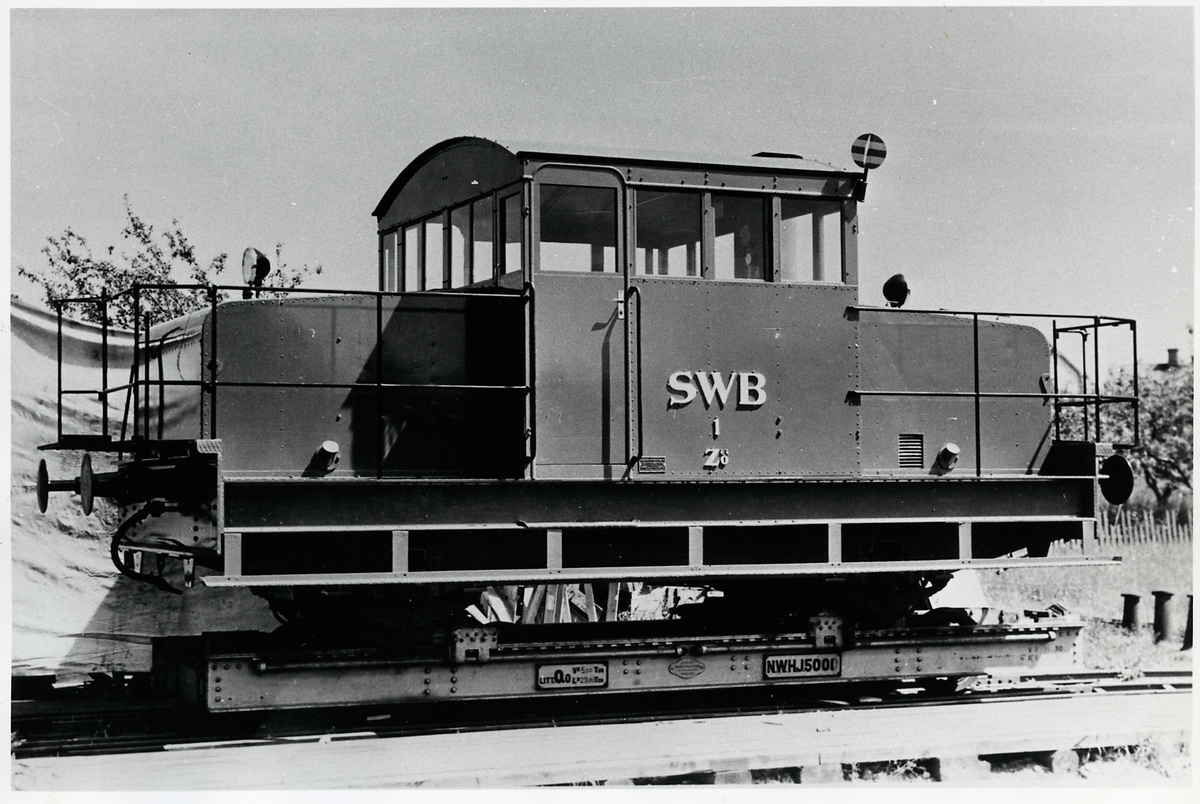 Leverans av lokomotor vid Västerviks hamn. Norsholm - Västervik - Hultsfreds Järnvägar, NVHJ Qq 5001 och Stockholm - Västerås - Bergslagens Järnvägar, SWB Zö 1.