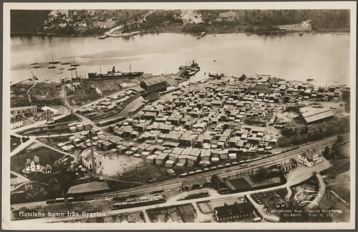 Flygfoto över hamn och lagerplats vid Gamlebyviken.