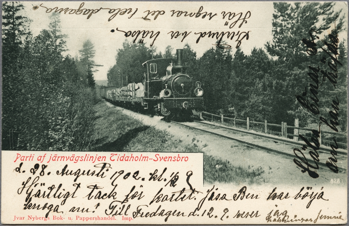 Titel: Ånglok med timmervagnar på linjen mellan Tidaholm och Svensbro.